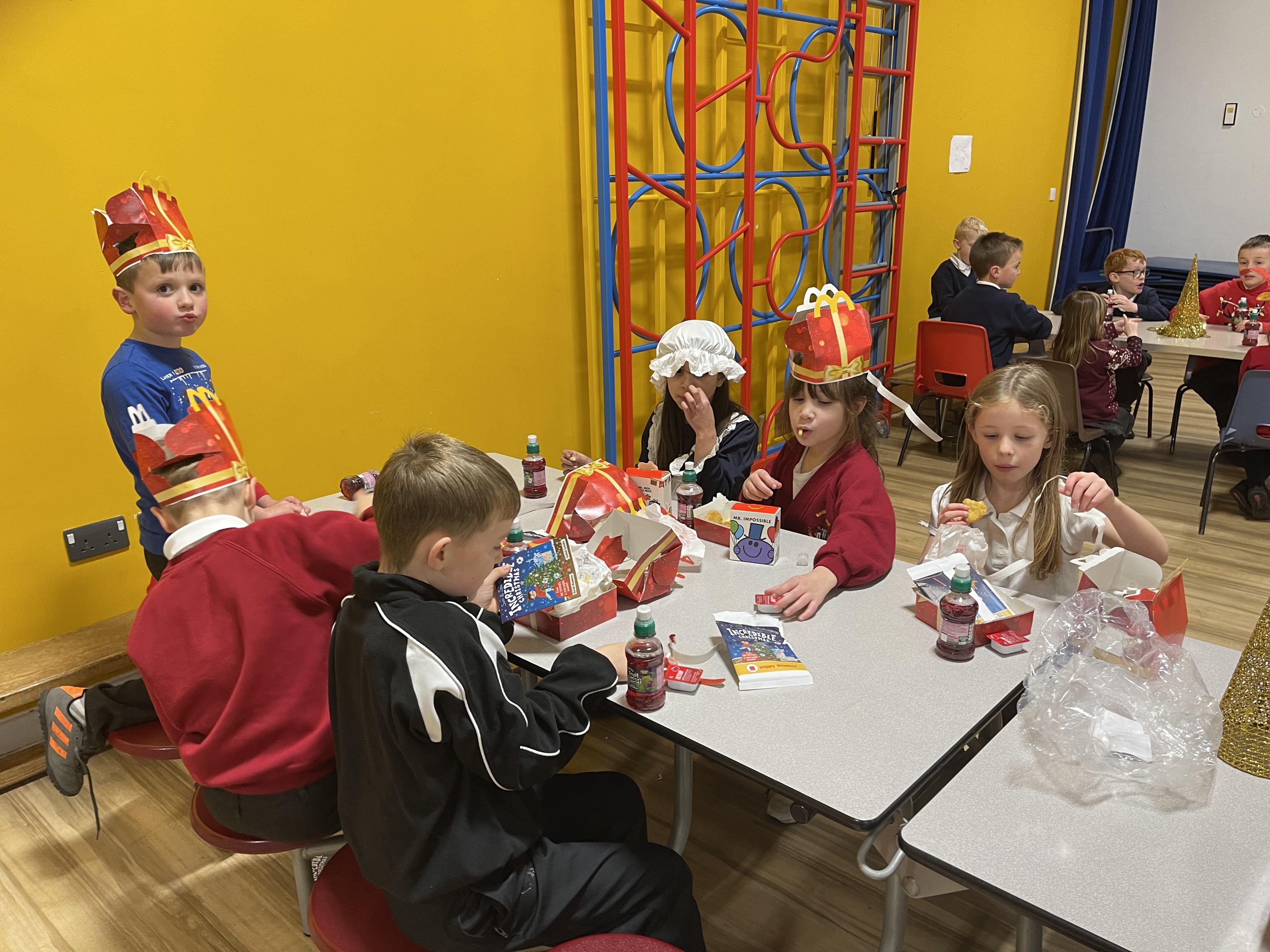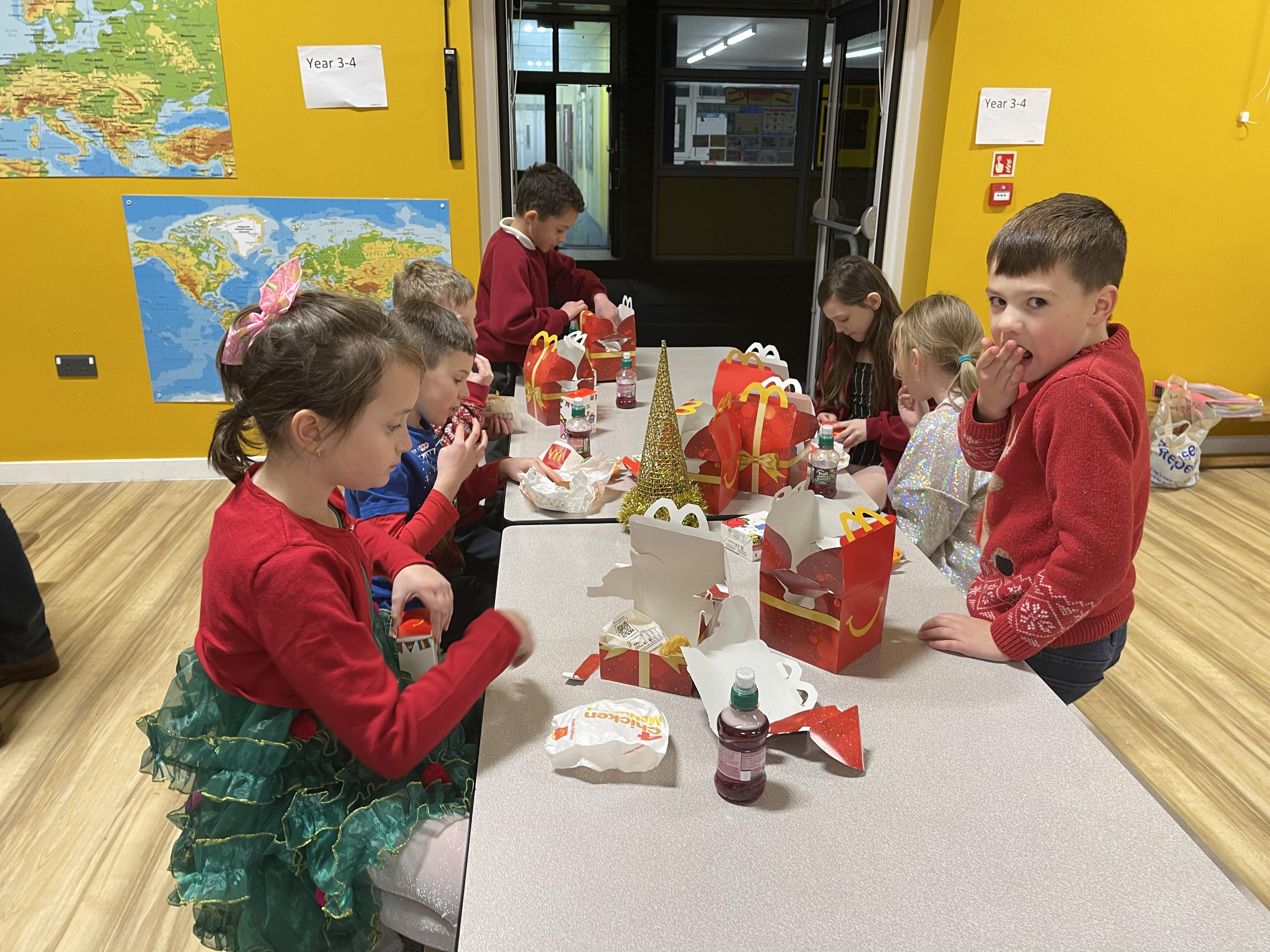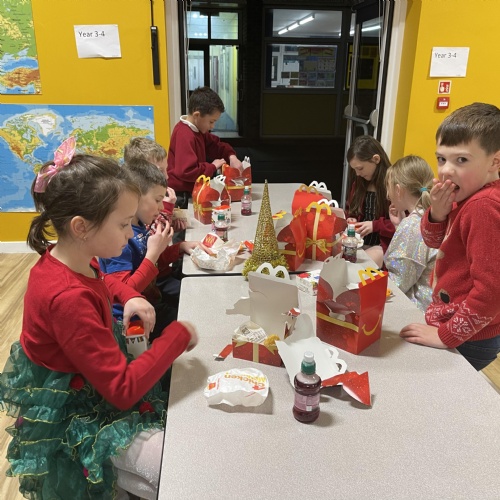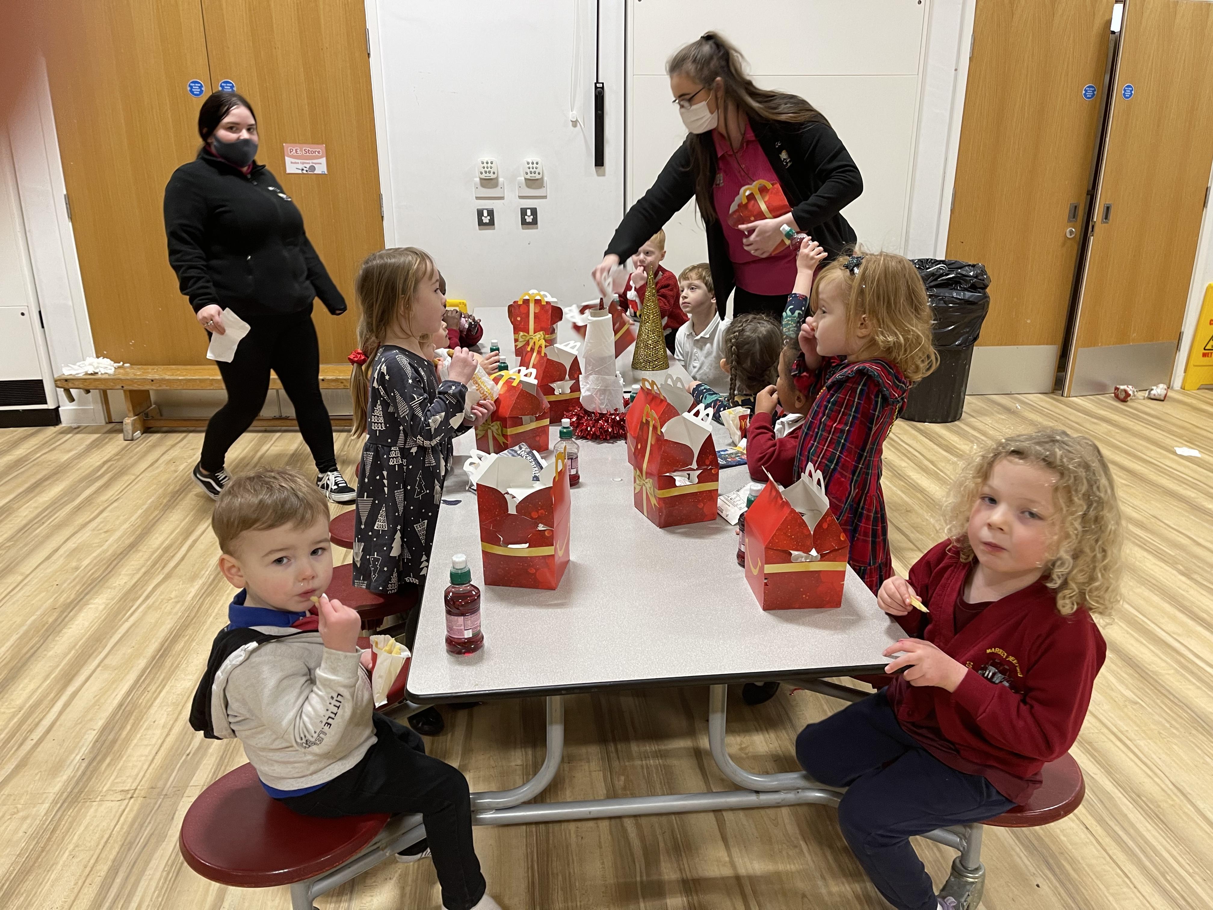 We have managed to use the tables to create bubbles so that we could safely hold our Christmas party this year!  Team games, dancing games and our silly snowman competition and visiting Father Christmas was fun!  We finished off with MacDonalds meals, Rainbow Ice Cream Cones and presents!